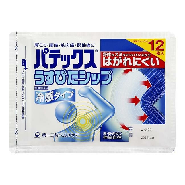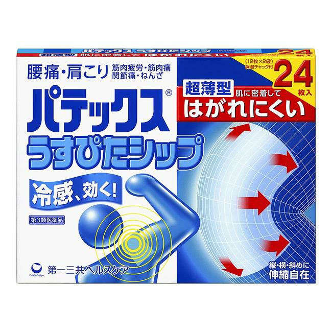 他の画像を見る ピタッと密着する超薄型の冷感シップ 【第3類医薬品】 パテックスうすぴたシップ 24枚 - 第一三共ヘルスケア [セルフメディケーション税制対象] [肩こり/腰痛] 定価 ¥ 1,430 販売価格 ¥ 1,056 税込 会員価格あり 在庫切れ 「パテックスうすぴたシップ 24枚」は、超薄型で衣類にからみつきにくく、しかも膏体がスミまでついているため、肌に密着してはがれにくい冷感シップ剤です。 詳細を見る お気に入りに登録する