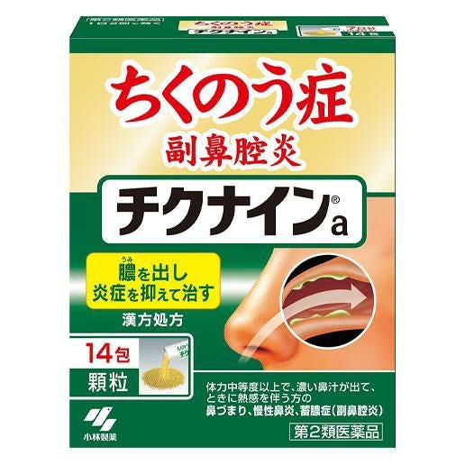 「小林製薬 チクナインa 顆粒 14包」は、ちくのう症(副鼻腔炎)、慢性鼻炎を改善する内服薬です。9種類の生薬からなる漢方「辛夷清肺湯(シンイセイハイトウ)」の働きで、鼻の奥の炎症を鎮めながら、膿を抑えて呼吸を楽にします。1日2回で効く、服用しやすいスティックタイプの顆粒剤です。