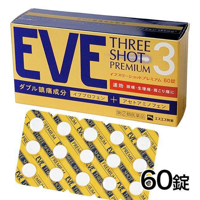 「イブクイック頭痛薬DX 60錠」は、イブスリーショットプレミアムは、頭痛、生理痛、肩こり痛にしっかり効くように設計された製剤です。イブプロフェンとアセトアミノフェンのダブル鎮痛成分を配合。イブプロフェンの速い溶出を実現した独自技術クイックアクション錠を採用。胃を守る酸化マグネシウム(胃粘膜保護成分)配合、さらに眠くなる成分は無配合。