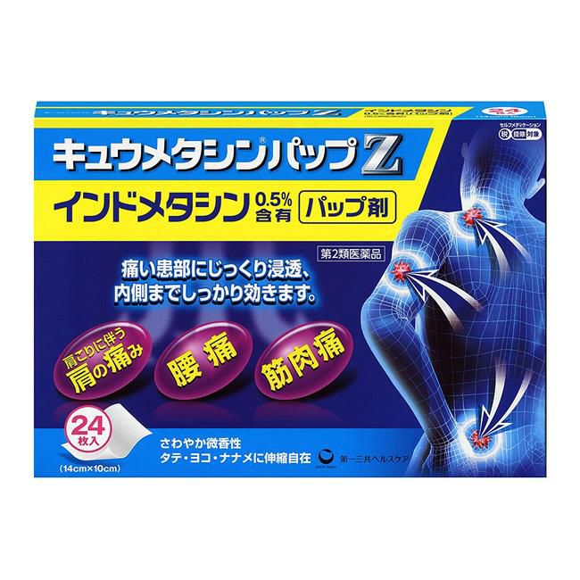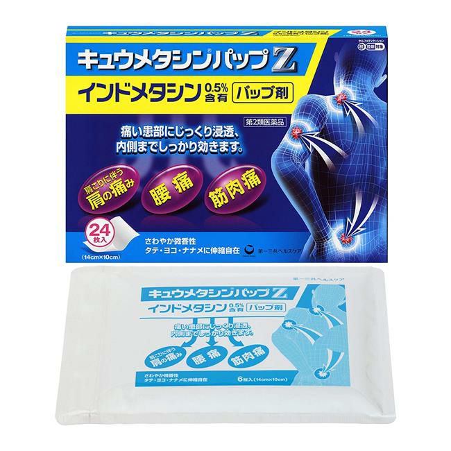 他の画像を見る つらい肩こりによる肩の痛み、腰痛、関節痛に 【第2類医薬品】 キュウメタシンパップZ 24枚 - 第一三共ヘルスケア [セルフメディケーション税制対象] [肩こり/腰痛] 定価 ¥ 2,376 販売価格 ¥ 880 税込 在庫切れ 「キュウメタシンパップZ 24枚」は、痛みの原因となる物質の生成をおさえ、肩・腰・関節のつらい痛みにすぐれた効果を発揮するインドメタシンを0.5%配合した鎮痛消炎パップ剤です。 詳細を見る お気に入りに登録する