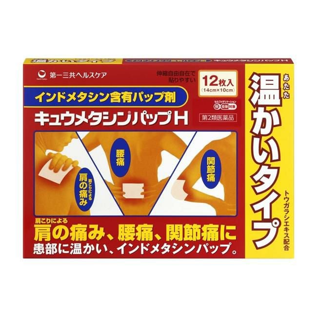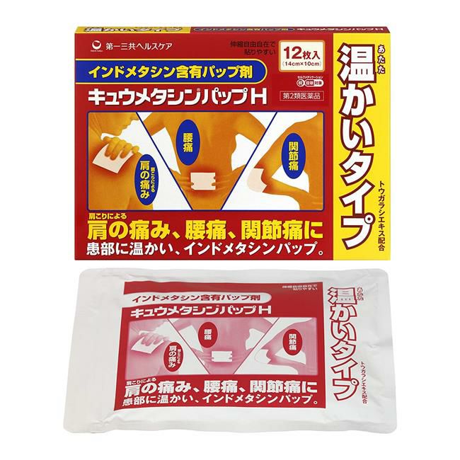 他の画像を見る トウガラシエキス配合の温かいパップ剤 【第2類医薬品】 キュウメタシンパップH 12枚 - 第一三共ヘルスケア [セルフメディケーション税制対象] [肩こり/腰痛] 定価 ¥ 1,320 販売価格 ¥ 550 税込 「キュウメタシンパップH 12枚」は、痛みの原因となる物質の生成をおさえ、肩・腰・関節のつらい痛みにすぐれた効果を発揮するインドメタシンを配合した温かいタイプの鎮痛消炎パップ剤です。 詳細を見る お気に入りに登録する