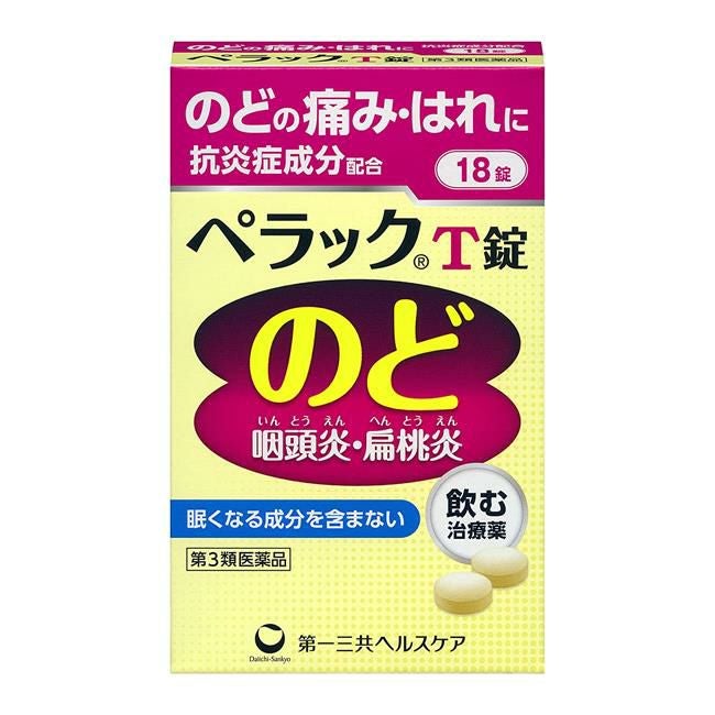 他の画像を見る のどの痛み、はれに。トラネキサム酸配合 【第3類医薬品】 ペラックT錠 18錠 - 第一三共ヘルスケア [咽頭炎/扁桃炎] 定価 ¥ 1,430 販売価格 ¥ 1,287 税込 在庫切れ 「ペラックT錠 18錠」は、のどの炎症をおさえるトラネキサム酸に、カンゾウ乾燥エキスと3種類のビタミンを配合した、のどの痛み、はれをおさえる、ひんやりとした服用感のある細粒です。 詳細を見る お気に入りに登録する