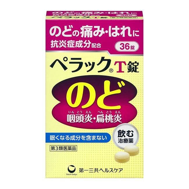 他の画像を見る のどの痛み、はれに。トラネキサム酸配合 【第3類医薬品】 ペラックT錠 36錠 - 第一三共ヘルスケア [咽頭炎/扁桃炎] 定価 ¥ 2,640 販売価格 ¥ 2,376 税込 在庫切れ 「ペラックT錠 36錠」は、のどの炎症をおさえるトラネキサム酸に、カンゾウ乾燥エキスと3種類のビタミンを配合した、のどの痛み、はれをおさえる、ひんやりとした服用感のある細粒です。 詳細を見る お気に入りに登録する