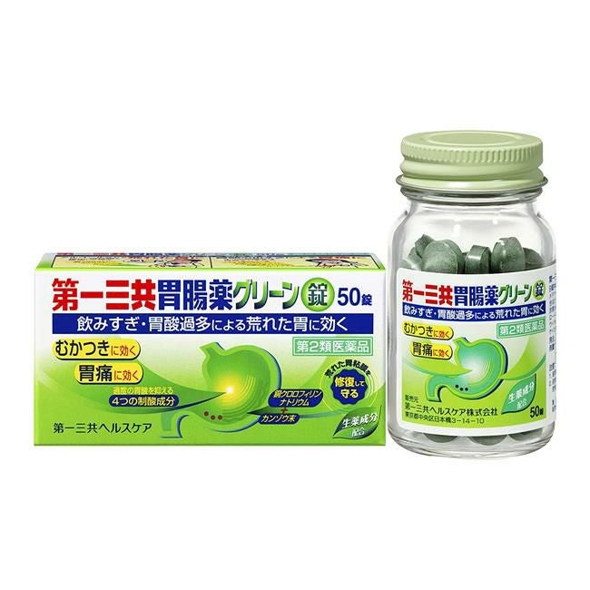 他の画像を見る 飲みすぎ・胃酸過多による荒れた胃に効く 【第2類医薬品】 第一三共胃腸薬グリーン錠 50錠 - 第一三共ヘルスケア [飲み過ぎ/胃酸過多] 定価 ¥ 968 販売価格 ¥ 767 税込 在庫切れ 「第一三共胃腸薬グリーン錠 50錠」は、「銅クロロフィリンナトリウム」と「カンゾウ末」が、荒れた胃の粘膜を修復して、胃酸などから胃粘膜を守ります。 詳細を見る お気に入りに登録する