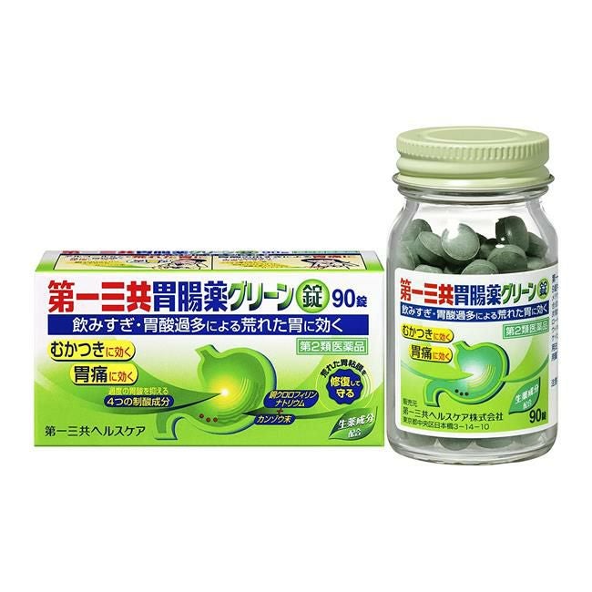 他の画像を見る 飲みすぎ・胃酸過多による荒れた胃に効く 【第2類医薬品】 第一三共胃腸薬グリーン錠 90錠 - 第一三共ヘルスケア [飲み過ぎ/胃酸過多] 定価 ¥ 1,628 販売価格 ¥ 1,210 税込 「第一三共胃腸薬グリーン錠 90錠」は、「銅クロロフィリンナトリウム」と「カンゾウ末」が、荒れた胃の粘膜を修復して、胃酸などから胃粘膜を守ります。 詳細を見る お気に入りに登録する