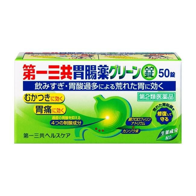 「第一三共胃腸薬グリーン錠 50錠」は、「銅クロロフィリンナトリウム」と「カンゾウ末」が、荒れた胃の粘膜を修復して、胃酸などから胃粘膜を守ります。「4つの制酸成分」が、過度の胃酸を抑え胃痛を鎮め、「5つの健胃生薬」が、弱った胃の働きを高めます。