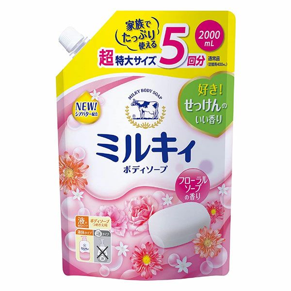「ミルキィボディソープ フローラルソープの香り 詰替用 2000ml」は、国産せっけん成分生まれでお肌のうるおいを守るシアバター(うるおい成分)を配合したボディソープです。クリーミーな泡で肌の潤いを守りながら、汚れをスッキリ洗いながし、すべすべなお肌に。華やかなローズ、ピオニーをメインとしたフローラルに、清潔感のあるせっけんの香りをプラスしたフローラルソープの香り。