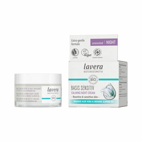 「ラヴェーラ Lavera ベーシック カーミングナイトクリーム 50ml」は、刺激を受けやすく、敏感なお肌を落ち着かせる無香料の夜用保湿クリームです。 天然の有効成分エクトインがお肌のバリア機能をサポートします。オーガニックのアロエベラやアーモンドオイルの他、ココナツオイルを配合。お休み中のお肌に潤いと水分を与えて、しっとりふっくらしたお肌に仕上げます。敏感肌向け。