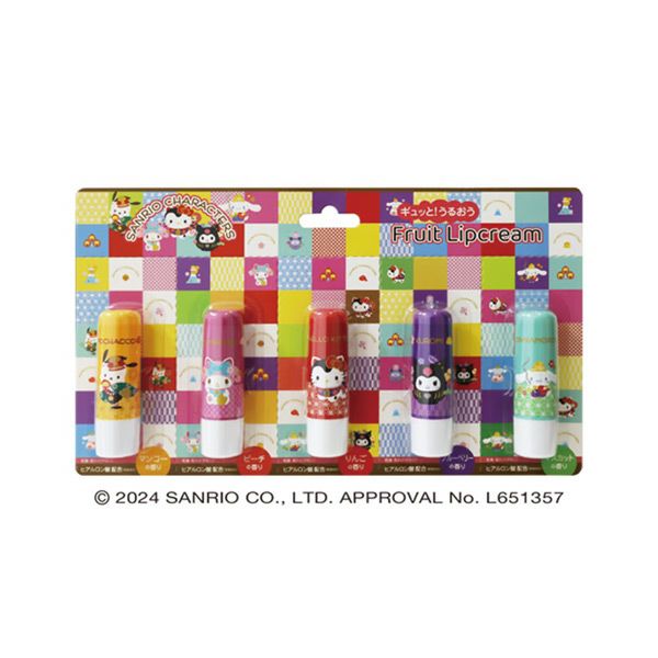 「ピエラス ギュッとうるおうフルーツ リップクリーム 和柄」は、サンリオ人気キャラクターが和柄リップになりました。ヒアルロン酸・ホホバオイル・シアバター・ビタミンE配合で唇をやさしくケアします。アップル・ピーチ・マンゴー・ブルーベリー・マスカットの5種類のもぎたてフルーツの香りです。キリトリ線入りなので、お友達とのシェアにもおすすめです。