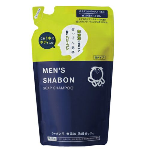 「メンズシャボンソープシャンプー つめかえ用 420ml」は、無添加せっけんの適度な洗浄力で、地肌を守り皮脂を取りすぎず、頭皮をすこやかに洗い上げます。べたつき、フケやカユミなどを抑え、せっけんの優れたすすぎ性で、さっぱりとした洗い心地です。泡タイプなので手に取りやすく、髪で泡立てる必要がないため、髪に負担が少ないのも特徴です。シリコン、合成ポリマー、合成界面活性剤、香料、着色料、酸化防止剤不使用。詰め替え用。