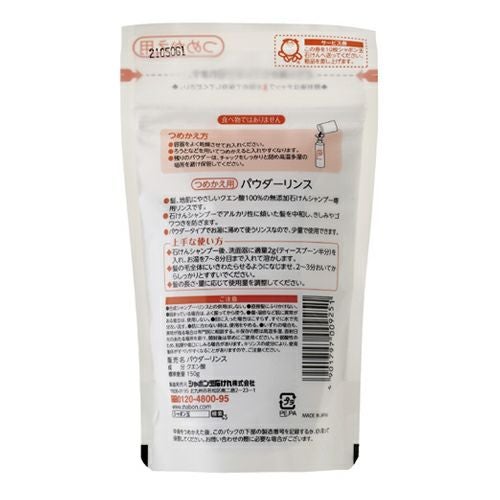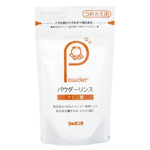 他の画像を見る パウダーリンス つめかえ用 150g - シャボン玉石けん 販売価格 ¥ 979 税込 在庫切れ 「パウダーリンス つめかえ用 150g」は、クエン酸100%の石けんシャンプー専用リンスです。 再入荷お知らせ お気に入りに登録する