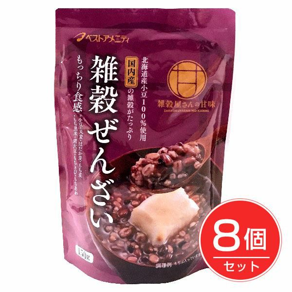「ベストアメニティ 国内産 雑穀ぜんざい 150g」は、国内産八種類の雑穀を使用したぜんざいです。小豆だけでなく穀物を入れることによって、もちもちとした食感をプラスしたぜんざいとなっています。具材感たっぷりのため、そのまま召し上がって頂いても十分満足いただけます。 ★お得な8個セット