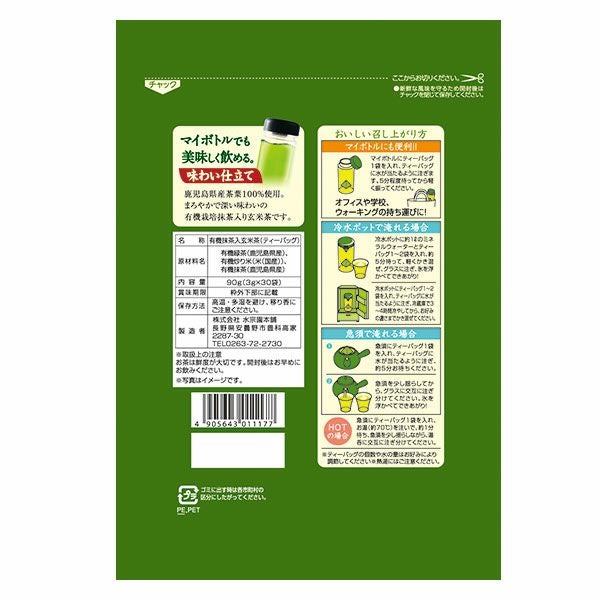 他の画像を見る 水宗園本舗 有機栽培抹茶入り玄米茶 3g×30包×10個セット 定価 ¥ 4,320 販売価格 ¥ 4,158 税込 送料無料 「水宗園本舗 有機栽培抹茶入り玄米茶 3g×30包」は、鹿児島県で生産された有機栽培茶葉に国産有機玄米を加えた、ティーバックタイプの抹茶入り玄米茶です。 カートに入れる お気に入りに登録する