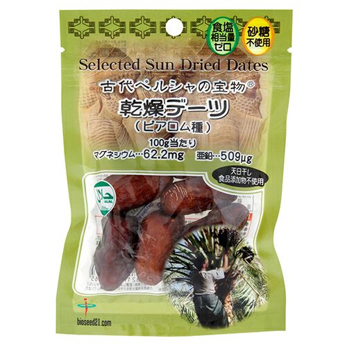 「乾燥デーツ ピアロム種 50g」は、砂糖、食品添加物、着色、オイルも一切不使用で自然の味そのままを袋詰めしました。味は干し柿に似た濃厚な甘みがあります。鉄分やマグネシウム等のミネラルが豊富に含まれており、女性にうれしい果実です。種を取り除いて、そのままサラダやデザートに。シリアル、パンやお菓子作りまたは刻んでカレーや煮込み料理やソースにご利用ください。ハラール認証取得品。