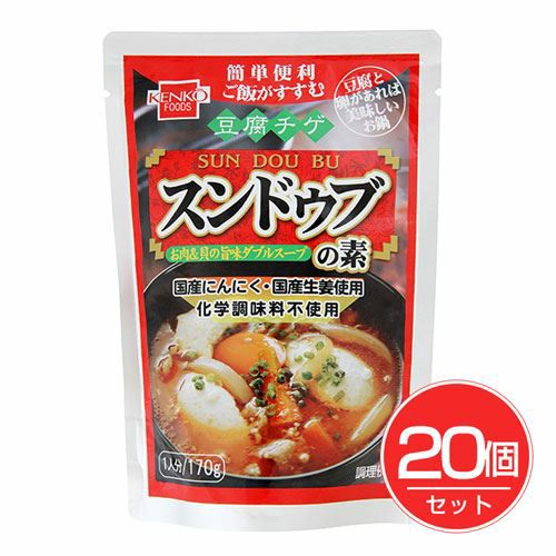 「健康フーズ スンドゥブの素 170g」は、国産にんにく・国産生姜・国内製造の豆板醤を使用し、お肉と貝エキスのダブルの旨味で仕上げた、濃厚でコクのあるスープが特長のスンドゥブの素です。豆腐と卵があれば、手軽に簡単おいしいスンドゥブチゲが作れます。お好みで野菜、キムチ、きのこなどを加えてお召し上がりください。 ★お得なまとめ買いセット