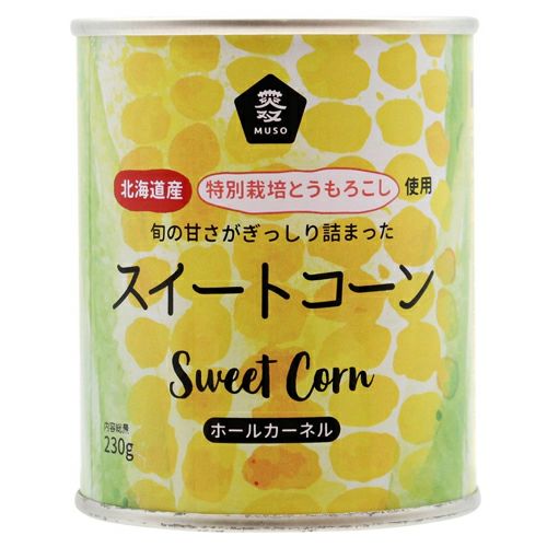 「ムソー スイートコーン 230g」は、 北海道特別栽培とうもろこしを海の精の塩で味付け(塩分1.2%)したスイートコーンです。品種はハニーバンダム種。粒の大きくしっかり、シャキシャキした食感が楽しめます。とうもろこしの実が熟す8~9月頃の早朝に収穫したとうもろこしをすぐに工場へ運び、最良の粒を缶に詰めます。味付けは海の精の塩のみ。とうもろこし自体の甘味を引き出します。ホールカーネル。