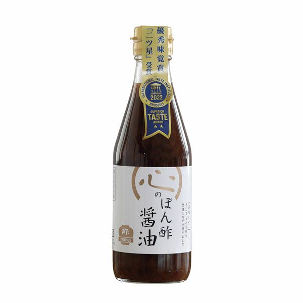 「心のぽん酢醤油 300ml」は、山形産有機コシヒカリでつくった「心の酢」、高知産有機ゆず果汁使用。だしの旨みとまろやかな酸味のポン酢しょうゆです。かつお厚削り、みついし昆布、原木栽培乾しいたけでだしをとっています。鍋物やサラダ、餃子のたれなどさまざまな料理に。