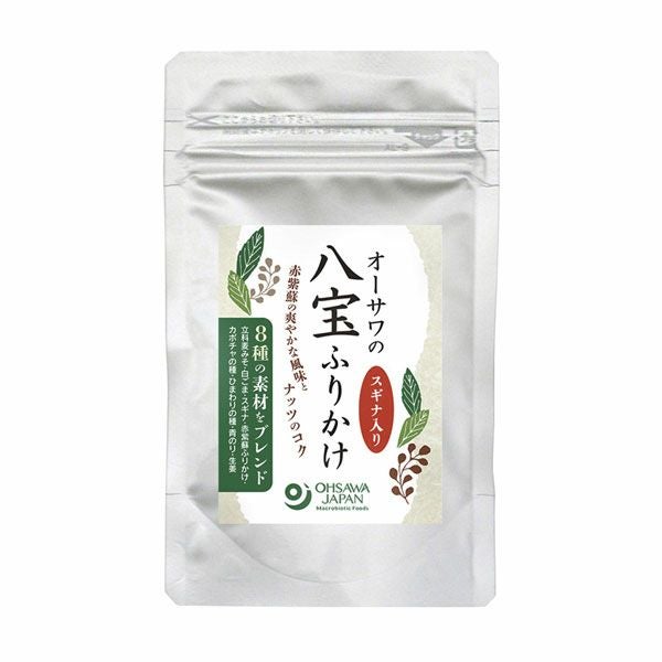 「オーサワの八宝ふりかけ スギナ入り 30g」は、8種類の素材(立科麦みそ、白ごま、スギナ、赤紫蘇ふりかけ、カボチャの種、ひまわりの種、青のり、生姜)をブレンドしたふりかけです。赤紫蘇の爽やかな風味とナッツのコク。玄米だけではなく分搗き米や白米にも合います。