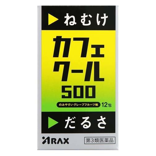 「アラクス カフェクール500 12包」は、シャキーン!!としたCoolな刺激がうれしい、ほろ苦酸っぱいグレープフルーツ味の眠気防止薬です。3包中に無水カフェイン500mgを配合したうえ、口溶けのよい白色の顆粒剤なので、眠ってはいけないときにねむけを感じたら、1日3回、どこでも水なしでも服用できます。