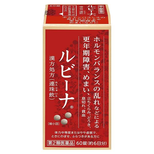 「ルビーナ 60錠」は、血のめぐりを良くして体を温め、水分代謝や乱れた自律神経のはたらきを整ることで体全体のバランスを良くしていき、のぼせや冷え症、めまいなど更年期のさまざまな症状に優れた効果を発揮します。体力中等度またはやや虚弱で、ときにのぼせ、ふらつきがある方の更年期障害(ホットフラッシュなど)に効果的です。