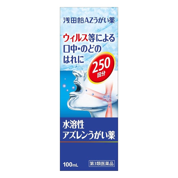 「浅田飴AZうがい薬 100mL」は、アズレンスルホン酸ナトリウム(水溶性アズレン)を配合した、ウィルスなどによる口中・のどのはれに効くうがい薬です。うがいをすることで口中やのど粘膜に直接作用し、アズレンスルホン酸ナトリウム(水溶性アズレン)がのどのはれを抑えます。たっぷり使える250回分。