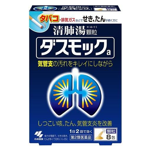 「小林製薬 ダスモックa 顆粒 8包」は、タバコや排気ガスなどで、せき・たんが続く方のお薬です。漢方処方「清肺湯(せいはいとう)」が気管支粘膜の汚れを取り除きながら、せき・たんをやわらげます。気管支の状態を正常に近づけ、呼吸をラクにしていきます。