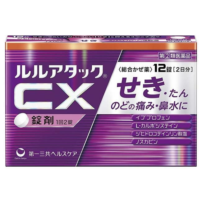 「ルルアタックCX 12錠」は、せき中枢にはたらく2種類の鎮咳成分「ジヒドロコデインリン酸塩」「ノスカピン」を配合。「dl-メチルエフェドリン塩酸塩」が気管支を ひろげて呼吸を楽にし、つらいせきをしずめます。また、「L-カルボシステイン」がのどにからんだたんを薄め、気道粘膜を正常な状態にすることで、せきの原因の1つとなるたんを出しやすくします。抗炎症成分イブプロフェンがのどの痛みや発熱に、抗ヒスタミン成分d-クロルフェニラミンマレイン酸塩がカゼのアレルギー症状(鼻水、鼻づまり等)に、すぐれた効果を発揮します。