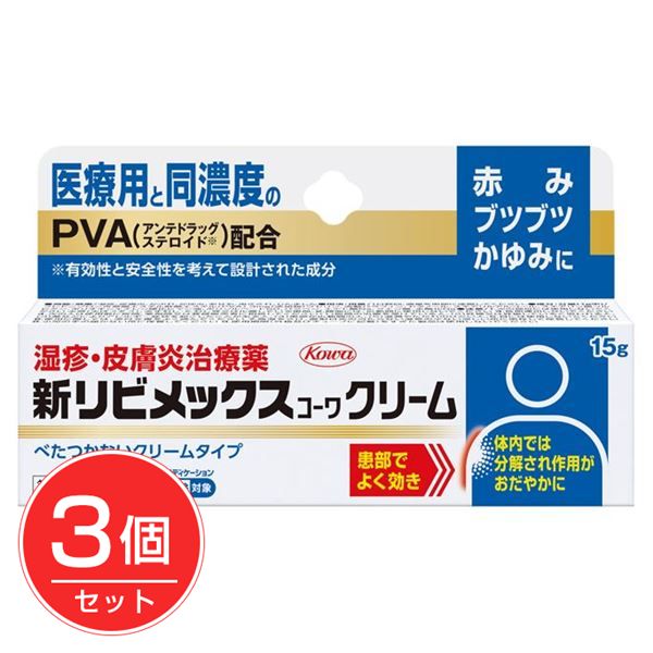 他の画像を見る しっしん、皮膚炎に、医療用と同濃度 【指定第2類医薬品】 新リビメックスコーワクリーム 15g×3個セット - 興和 [セルフメディケーション税制対象] [数量限定セール] ※ネコポス対応商品 [皮膚炎/ステロイド] 販売価格 ¥ 3,465 税込 会員価格あり 送料無料 ネコポス便対応品 「新リビメックスコーワクリーム」は、すぐれた抗炎症作用を有するPVA(プレドニゾロン吉草酸エステル酢酸エステル)を医療用と同濃度の0.3%配合。 詳細を見る お気に入りに登録する