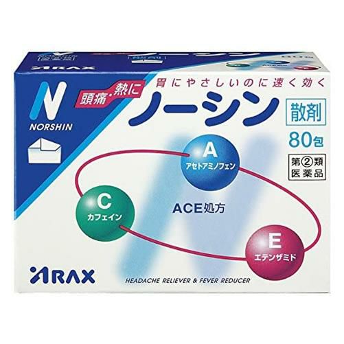 「アラクス ノーシン散剤 80包」は、ACE処方の3つの有効成分(アセトアミノフェン、エテンザミド、カフェイン水和物)が協力的に作用して、頭痛などの痛みや熱によく効きます。胃にやさしいのに速く効き、眠くなる成分や習慣性のある成分は含まれていません。