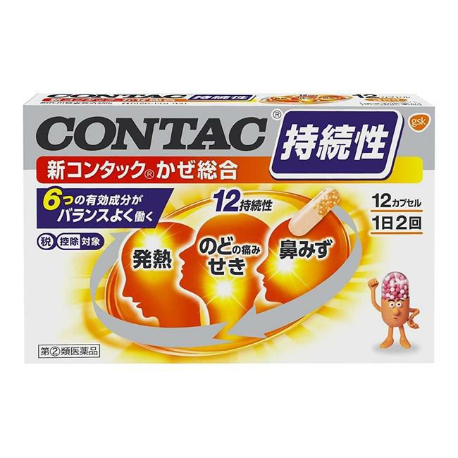 「新コンタックかぜ総合 12カプセル」は、解熱鎮痛成分アセトアミノフェンをはじめ、6つの有効成分がバランスよくはたらき、発熱、のどの痛み、せき、鼻みず、鼻づまりなどのかぜの諸症状を効果的に改善します。デキストロメトルファン臭化水素酸塩水和物、ブロムヘキシン塩酸塩とdl-メチルエフェドリン塩酸塩の複合効果でせきをしずめ、せきの原因のひとつとなるたんを出しやすくします。速放性と徐放性の顆粒が混合された処方で、服用後速やかに効果を発揮し、朝・夕1日2回の服用で安定した効果が持続します。