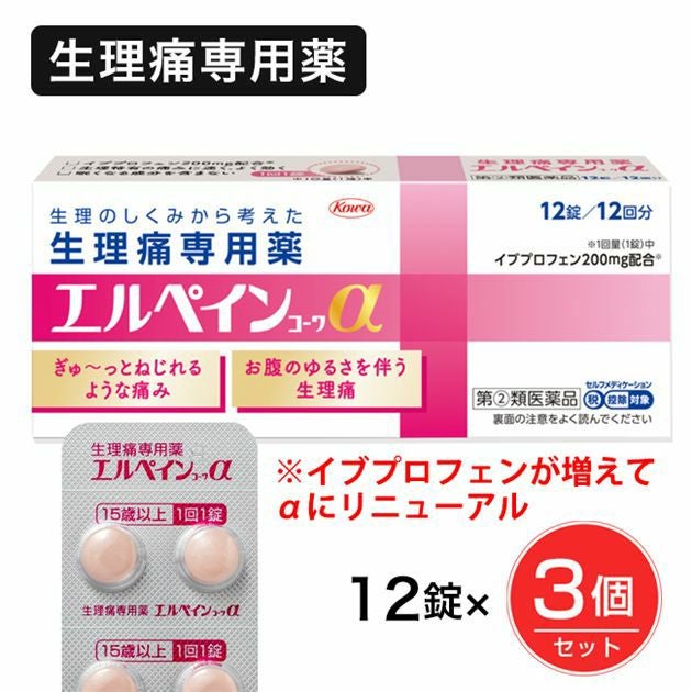 生理のしくみから考えた生理痛専用薬。2つの有効成分が「ねじれるような痛み」や「お腹のゆるさを伴う生理痛」によく効きます。 【指定第2類医薬品】 エルペインコーワα アルファ 24錠×3個セット - 興和 [セルフメディケーション税制対象] ※ネコポス対応商品 [生理痛] 販売価格 ¥ 5,500 税込 会員価格あり お気に入りに登録する