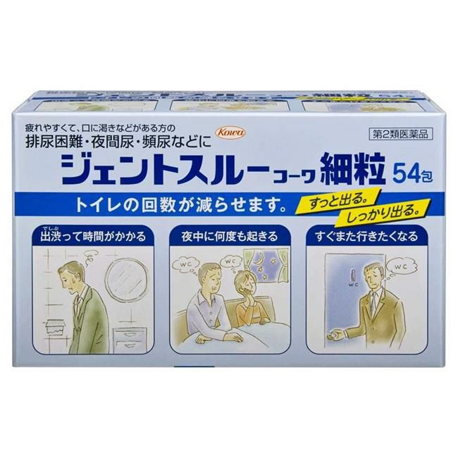 「ジェントスルーコーワ細粒 54包」は、疲れやすくて、口の渇きなどがある方の排尿困難、夜間尿、頻尿などの症状に効く10種の生薬の抽出エキスを配合。不快な排尿トラブルが改善され、次第に正常な状態になってまいります。