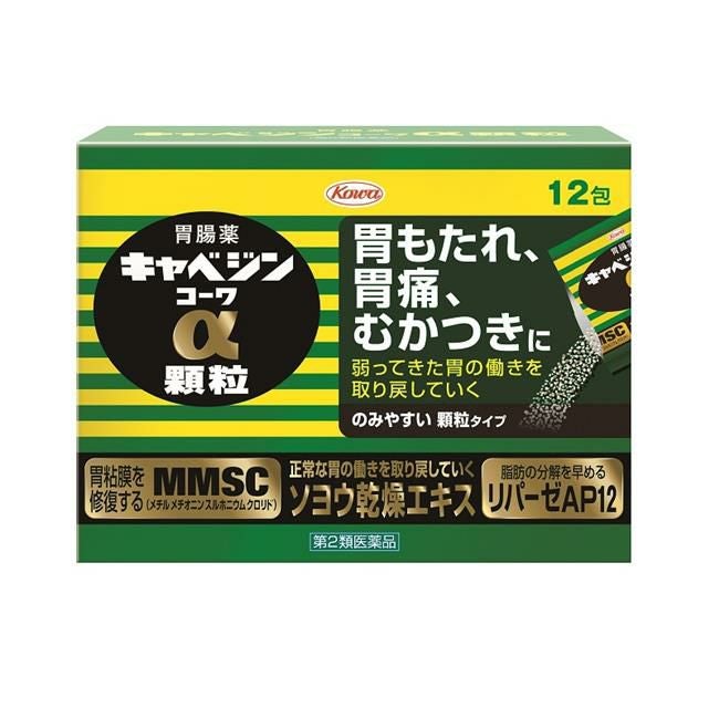 「キャベジンコーワα顆粒 12包」は、動きの鈍ってきた胃を元気に動かし、正常な胃の働きを取り戻してくれます。 胃の働きを良くしていく生薬ソヨウを配合した顆粒タイプの胃腸薬です。荒れて傷んだ胃の粘膜を修復し、正常な状態に整える有効成MMSCに加え、胃の働きを良くしていく生薬成分ソヨウを配合。