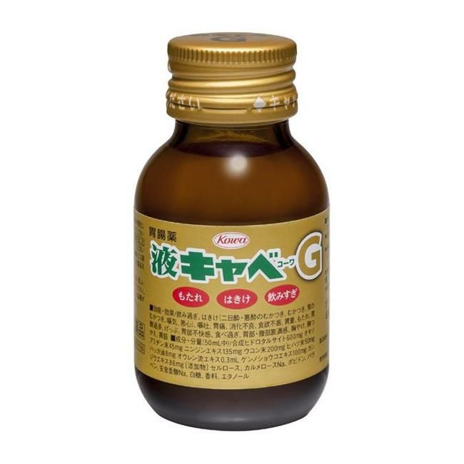 「液キャベコーワG 50mL」は、生薬の「ウコン」と「ヒハツ」を丸ごと配合しました。 二日酔いなどによる胃の不快症状を改善する液体胃腸薬です。オキソアミヂン末や人参乾燥エキスなど6種類の健胃生薬を配合しています。胃の働きを活発にして、もたれやはきけを抑えます。