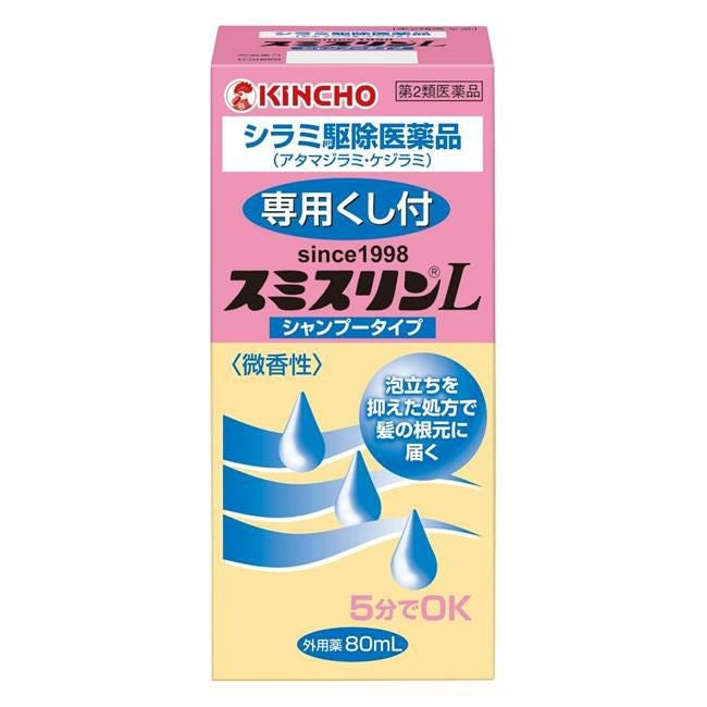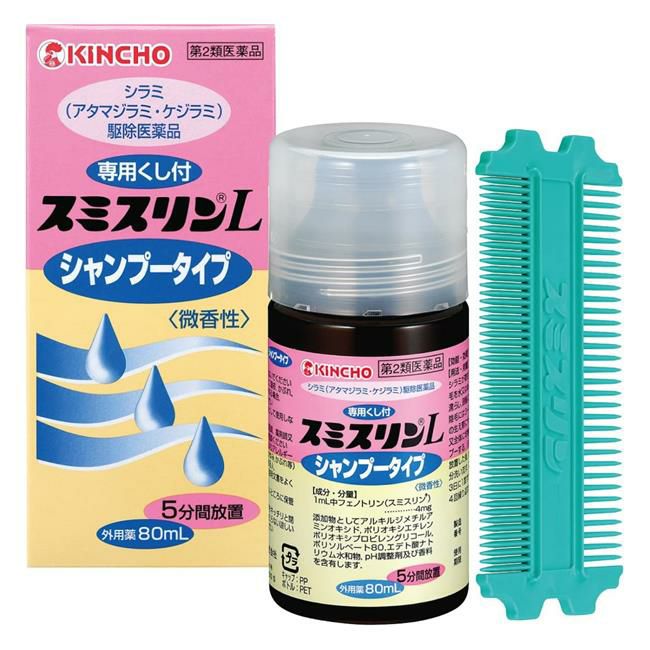 他の画像を見る シラミ駆除に優れた効果 【第2類医薬品】 スミスリンLシャンプータイプ 80ml - 大日本除蟲菊 [アタマジラミ/ケジラミ] 定価 ¥ 3,036 販売価格 ¥ 2,732 税込 会員価格あり 「スミスリンLシャンプータイプ 80ml」は、ヒトに寄生するアタマジラミ・ケジラミの駆除に優れた効果のある医薬品です。 詳細を見る お気に入りに登録する