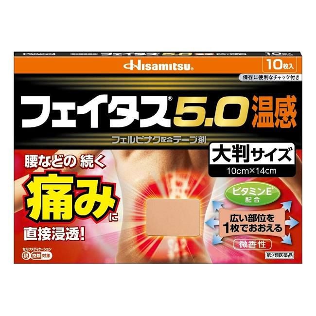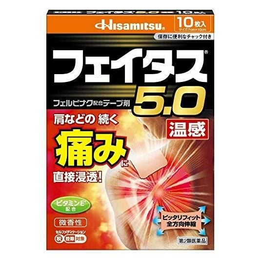 他の画像を見る 肩などの続く痛みに 【第2類医薬品】 フェイタス5.0温感 10枚 - 久光製薬 [セルフメディケーション税制対象] [消炎鎮痛/関節痛] 販売価格 ¥ 1,137 税込 「フェイタス5.0温感 10枚」は、効きめ成分フェルビナクを5.0%配合した、経皮鎮痛消炎テープ剤。 詳細を見る お気に入りに登録する