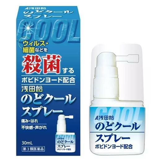 「浅田飴 浅田飴のどクールスプレー 30ml」は、ウィルスや細菌などを殺菌するポビドンヨードを配合した、のどの痛み・はれ、声がれに効くのどスプレーです。有効成分の口腔内殺菌消毒薬ポビドンヨードがあれたのど粘膜に直接作用し、のどを正常な状態に治します。携帯にも便利なオーバーキャップ付きで、メントールのさわやかな使用感です。