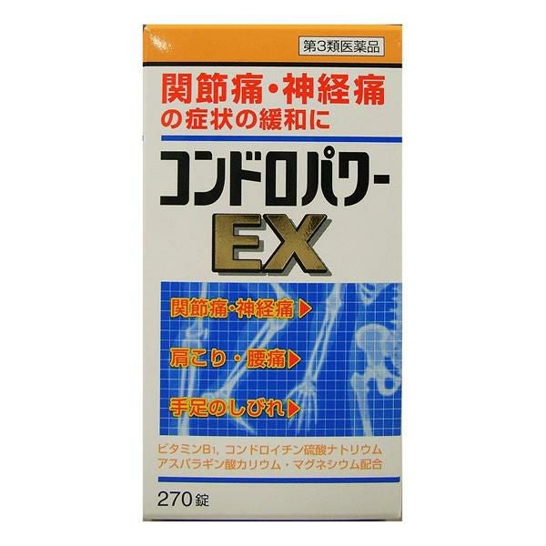 「コンドロパワーEX錠 270錠」は、コンドロイチン硫酸エステルナトリウム800mgに、緩衝材として塩酸グルコサミンを配合。互いに助けあって働きます。コンドロイチンは、軟骨に水分と栄養を与え、軟骨に弾力性と保水性を持たせ、さらに、軟骨を分解する酵素の働きを抑え、軟骨の摩滅を防ぎます。グルコサミンは、関節を守る主成分「プロテオグリカン」の合成を促し、軟骨の修復・再生をスムーズにします。ビタミンB1が関節痛・神経痛等の症状を緩和し、 アスパラギン酸がビタミンB1の働きを助けます。