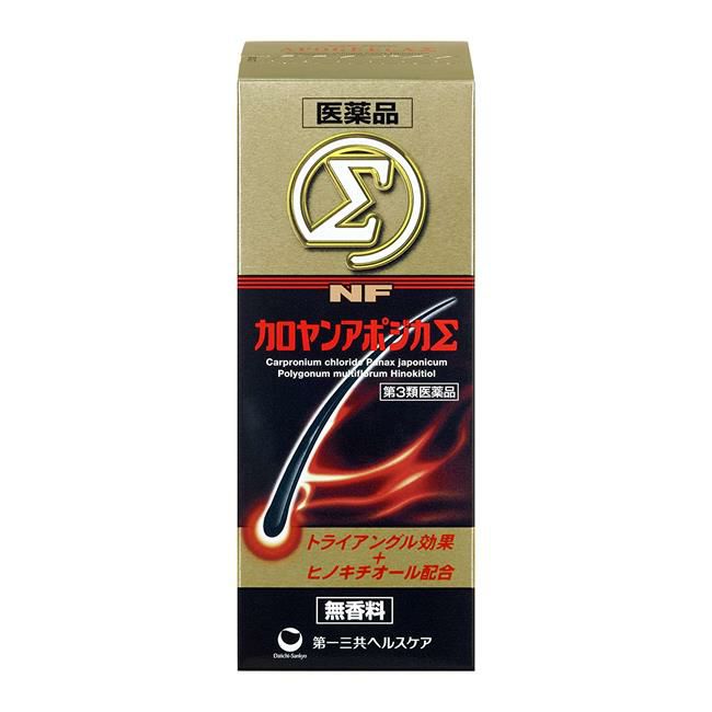 「NFカロヤンアポジカΣ 200ml」は、血行促進作用のある主成分カルプロニウム塩化物に、脂質除去作用のカシュウチンキと毛根刺激作用のチクセツニンジンチンキ(の2つの生薬成分を配合しています。血行を促進して脱毛を予防し発毛を促します。若はげ(壮年性脱毛症)、薄毛に。また毛量の気になり始めた方のふけ、かゆみに