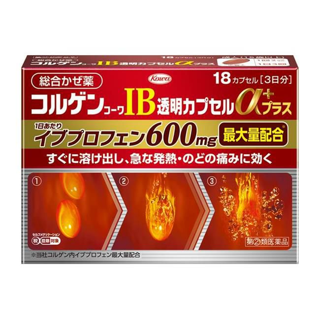 「コルゲンコーワIB透明カプセルαプラス 18カプセル」は、すぐれた効き目の6つの有効成分をすべて液状に溶かし込んでカプセルに閉じ込めている為、有効成分が体の中でいち早く溶け出し、発熱・のどの痛みを抑えます。イブプロフェン(1日あたり)最大量600mg配合。しつこい咳の原因となるたんを出しやすくするアンブロキソール塩酸塩を配合し、かぜのひきはじめはもちろん、かぜの後期の症状(しつこく残るせき、たん)にも対応します。