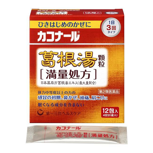 他の画像を見る ひきはじめのかぜに、満量処方の葛根湯製剤。1日2回服用タイプ 【第2類医薬品】 カコナール2 葛根湯顆粒満量 12包 - 第一三共ヘルスケア [セルフメディケーション税制対象] [かぜの初期/鼻かぜ] 定価 ¥ 1,870 販売価格 ¥ 1,540 税込 「カコナール2 葛根湯顆粒満量 12包」は、ひきはじめのかぜによく効く葛根湯製剤です。 詳細を見る お気に入りに登録する