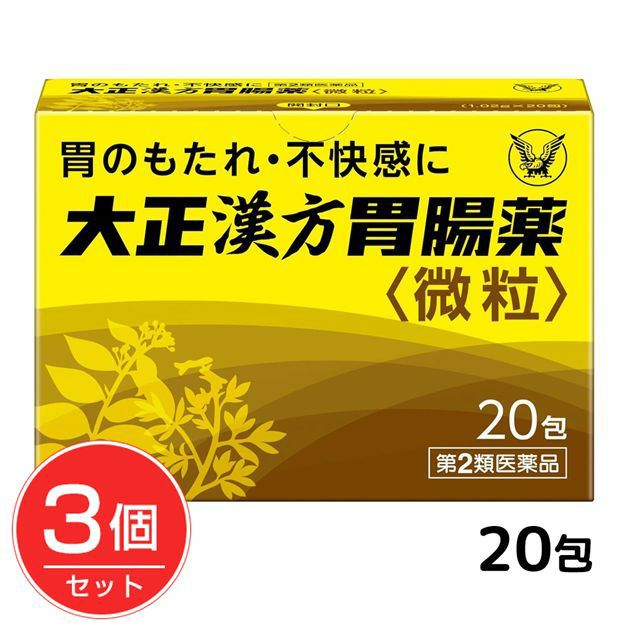 他の画像を見る 胃のもたれ、胃部不快感、胸やけ、むかつきなどの症状に 【第2類医薬品】 大正漢方胃腸薬 20包×3個セット - 大正製薬 [胃のもたれ/胃部不快感] 定価 ¥ 5,266 販売価格 ¥ 3,410 税込 会員価格あり 送料無料 在庫切れ 「大正漢方胃腸薬 20包」は、安中散と芍薬甘草湯の組み合わせにより、ふだんから胃腸が弱く、不規則な食生活や夏バテなどが原因の不調や、食欲が出ないといった方に適した胃腸薬です。 詳細を見る お気に入りに登録する