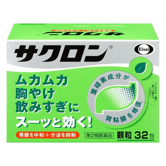 「サクロン 32包」は、出過ぎた胃酸の働きを弱め(中和)、分泌を抑制し、荒れた胃粘膜を葉緑素から作られた緑の成分で修復・保護します。胃がムカムカしたり、キリキリ痛む方や、朝、歯みがき中にウッとなる方に。サクロンはスーッと飲めば、スーッと効きます。
