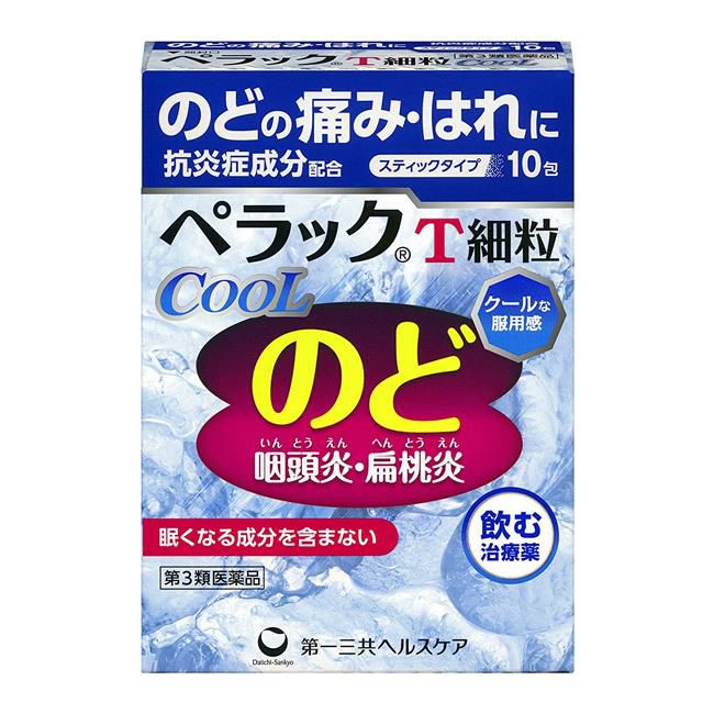 「ペラックT細粒クール 10包」は、のどの炎症をおさえるトラネキサム酸に、カンゾウ乾燥エキスと3種類のビタミンを配合した、のどの痛み、はれをおさえる、ひんやりとした服用感のある細粒です。7歳以上のお子さまから服用いただけます。眠くなる成分は入っていません。