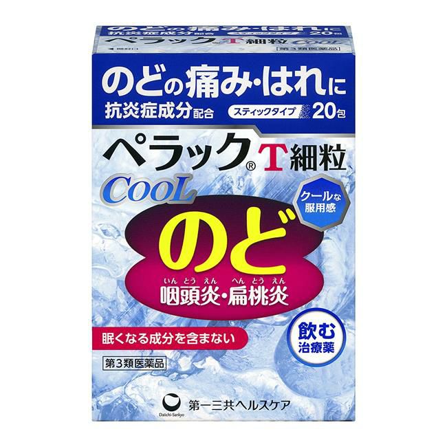 「ペラックT細粒クール 20包」は、のどの炎症をおさえるトラネキサム酸に、カンゾウ乾燥エキスと3種類のビタミンを配合した、のどの痛み、はれをおさえる、ひんやりとした服用感のある細粒です。7歳以上のお子さまから服用いただけます。眠くなる成分は入っていません。