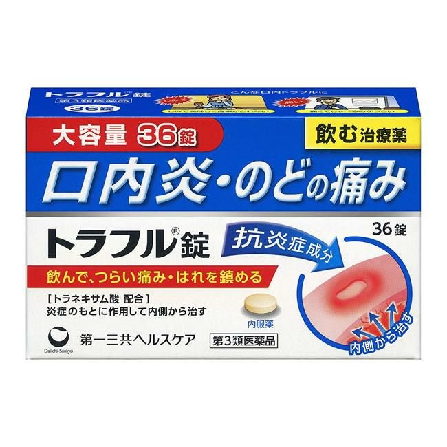 他の画像を見る 痛い口内炎に飲んで治す治療薬 【第3類医薬品】 トラフル錠 36錠 - 第一三共ヘルスケア [口内炎/咽頭炎] 定価 ¥ 2,365 販売価格 ¥ 2,128 税込 在庫切れ 「トラフル錠 36錠」は、抗炎症成分トラネキサム酸が、炎症のもとに作用して痛み・はれをしずめます。 詳細を見る お気に入りに登録する