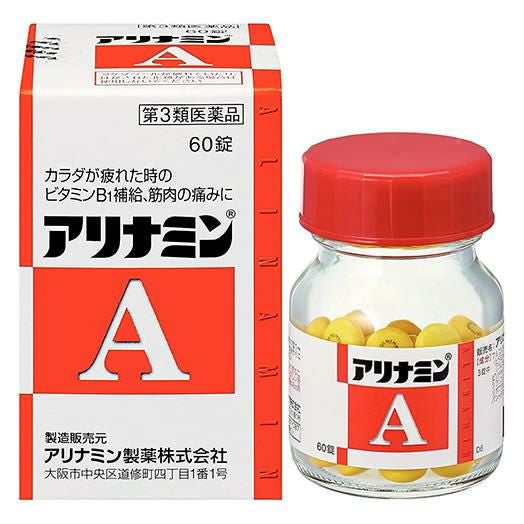 「アリナミン製薬 アリナミンA 60錠」は、吸収にすぐれたビタミンB1誘導体フルスルチアミンを配合し、毎日の生活の中で感じる、カラダが「だるい」「重い」といった疲れにすぐれた効果をあらわします。補酵素(コエンザイムA)となってエネルギーの産生に重要な働きをするパントテン酸カルシウムとフルスルチアミン、ビタミンB2、ビタミンB6を配合し、三大栄養素(脂質、タンパク質、糖質)を効率よくエネルギーに変える助けをするので、疲れたカラダにすぐれた効果をあらわします。服用しやすい黄色の糖衣錠です。