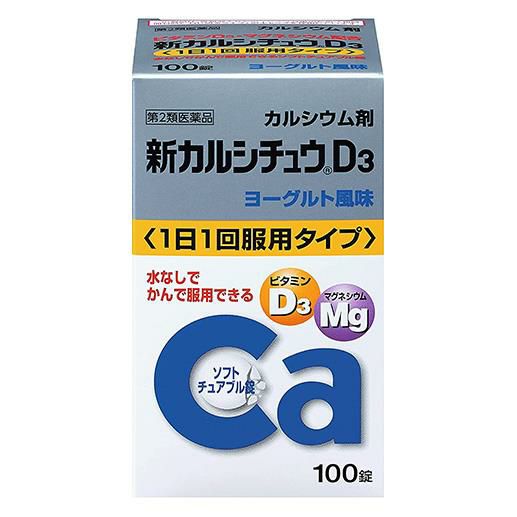 「アリナミン製薬 新カルシチュウD3 100錠」は、1日1回、2錠(15歳以上)で、カルシウム610mgが摂れます。カルシウムの吸収を促進するビタミンD3、さらにマグネシウムを配合しています。服用しやすい、かみくだけるソフトチュアブル錠。水なしでそのまま服用できます。さわやかなヨーグルト風味です。