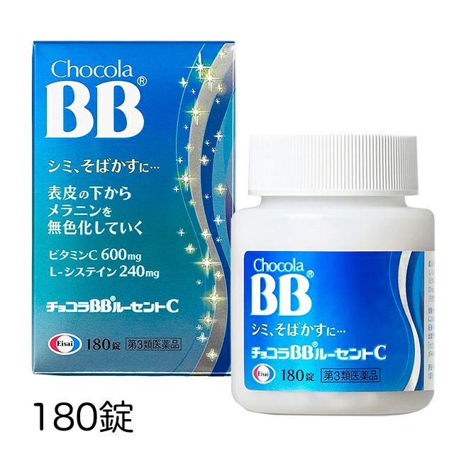 「チョコラBBルーセントC 180錠」は、ビタミンC600mgとL-システイン240mgを配合し、還元力(抗酸化力)により、表皮の下からメラニンを無色化し本来のキレイな肌を取り戻していきます。ビタミンB2・B6が、肌の代謝(ターンオーバー)を正常化し、ビタミンEが黒色メラニンの排出を促します。