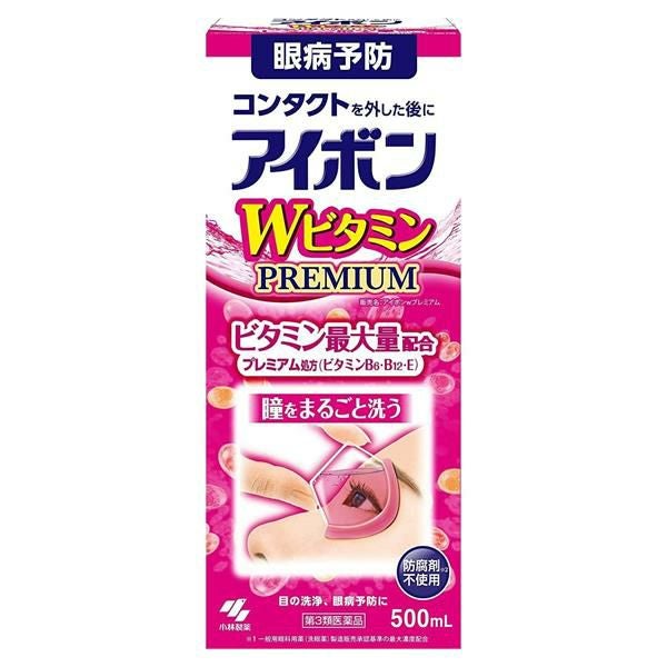 「アイボンWビタミンプレミアム」は、涙の層を安定させて大事な角膜を守ってくれる、角膜保護成分「コンドロイチン硫酸エステルナトリウム」とビタミンを最大量配合した、防腐剤無添加の目にしみないやさしい洗眼薬です。